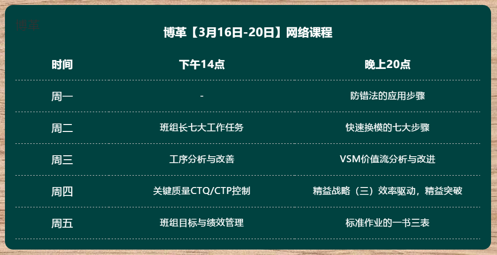 為助力企業(yè)在抗疫期間的穩(wěn)健發(fā)展,博革咨詢特推出騰訊課堂線上直播《金牌班組長(zhǎng)培訓(xùn)》《企業(yè)精益戰(zhàn)略實(shí)施》《精益工具應(yīng)用》等內(nèi)訓(xùn)精品課程,與您共渡難關(guān)!
