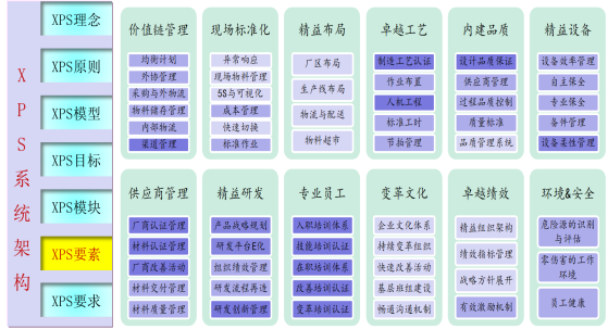 XPS按照集團(tuán)及下屬企業(yè)的形態(tài)和現(xiàn)狀,將整個(gè)運(yùn)營系統(tǒng)劃分為12大模塊,每個(gè)模塊都將以世界級的最佳時(shí)間為標(biāo)桿,幫助企業(yè)建立完善世界級企業(yè)的運(yùn)營模式,包括組織框架、運(yùn)營模式、人才隊(duì)伍、組織能力等,實(shí)現(xiàn)世界級的產(chǎn)品、質(zhì)量、效率和管理。
